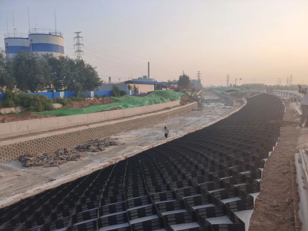為此,項(xiàng)目部精心策劃,周密部署,綜合考慮各項(xiàng)因素,充分調(diào)動(dòng)人力、物力、財(cái)力和空間資源,堅(jiān)持以“12368”戰(zhàn)略行動(dòng)方針為指引,攻堅(jiān)克難,全力推進(jìn)項(xiàng)目建設(shè)。經(jīng)過兩年的緊張施工,目前已完成苦池閘至運(yùn)三高速段4.4km的渠道清淤拓寬工作,沿線在右堤戧臺(tái)下方布設(shè)了4.3km截污干管,在渠口兩側(cè)安裝了8.3km的漢白玉護(hù)欄;重建了7座跨渠橋梁,新建了擋水堰6個(gè),增加景觀水面積4.4萬㎡,增加景觀綠化面積7.4萬㎡,同時(shí)新增了親水步道和照明設(shè)施。