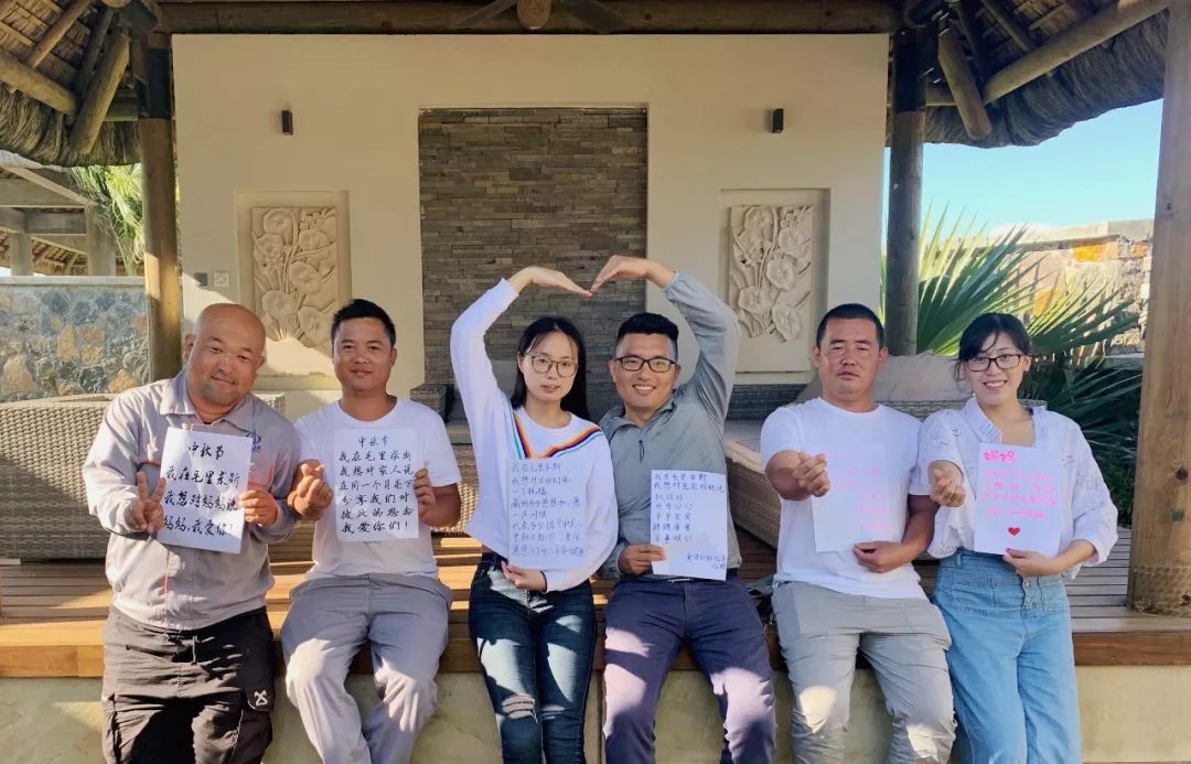 然而,長(zhǎng)期待在國(guó)外,工作之余,對(duì)家人的牽掛及愧疚時(shí)刻在衛(wèi)華的心頭縈繞。他的床頭和手機(jī)屏幕上總放著妻兒的照片。從孩子出生到現(xiàn)在18個(gè)月的時(shí)間里,他陪伴在旁的時(shí)間不足5個(gè)月,就連孩子的第一個(gè)生日都無(wú)法脫身。 但在工作與家庭面前,衛(wèi)華毅然選擇工作。他有一句座右銘:“把世界當(dāng)做自己的故鄉(xiāng)”。在“一帶一路”的逐夢(mèng)路上,他始終砥礪遠(yuǎn)行、奮斗無(wú)我! 像衛(wèi)華一樣 雖然他們身處異國(guó) 卻時(shí)刻心系祖國(guó) 心懷企業(yè) 心念家人 在歡度中秋、喜迎國(guó)慶之際 海外項(xiàng)目團(tuán)隊(duì)也從遙遠(yuǎn)的毛里求斯發(fā)來(lái) 對(duì)祖國(guó)的歌頌 對(duì)企業(yè)的祝福 對(duì)家人的思念