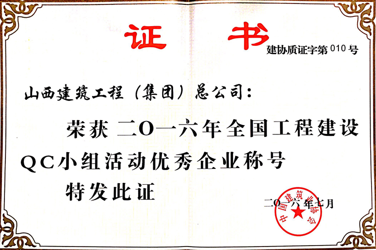 • 榮獲2016年全國工程建設(shè)QC小組活動優(yōu)秀企業(yè)稱號