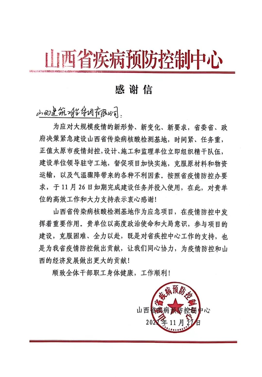 山西建投建工集團(tuán)承建的山西省核酸檢測(cè)方艙實(shí)驗(yàn)室項(xiàng)目收到業(yè)主方感謝信