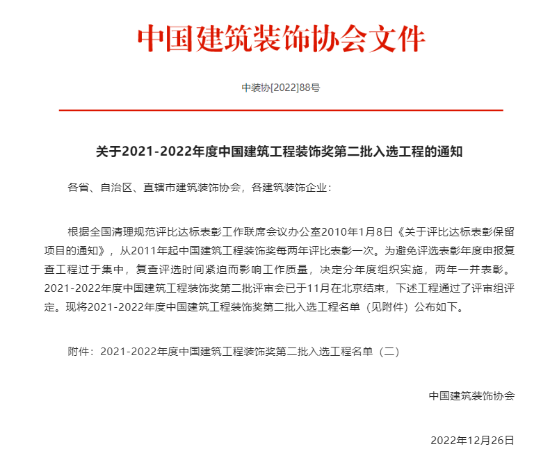 12月28日,中國建筑裝飾協(xié)會公布了關(guān)于2021-2022年度中國建筑工程裝飾獎第二批入選工程名單的通知,由山西建投建工集團(tuán)承建的: