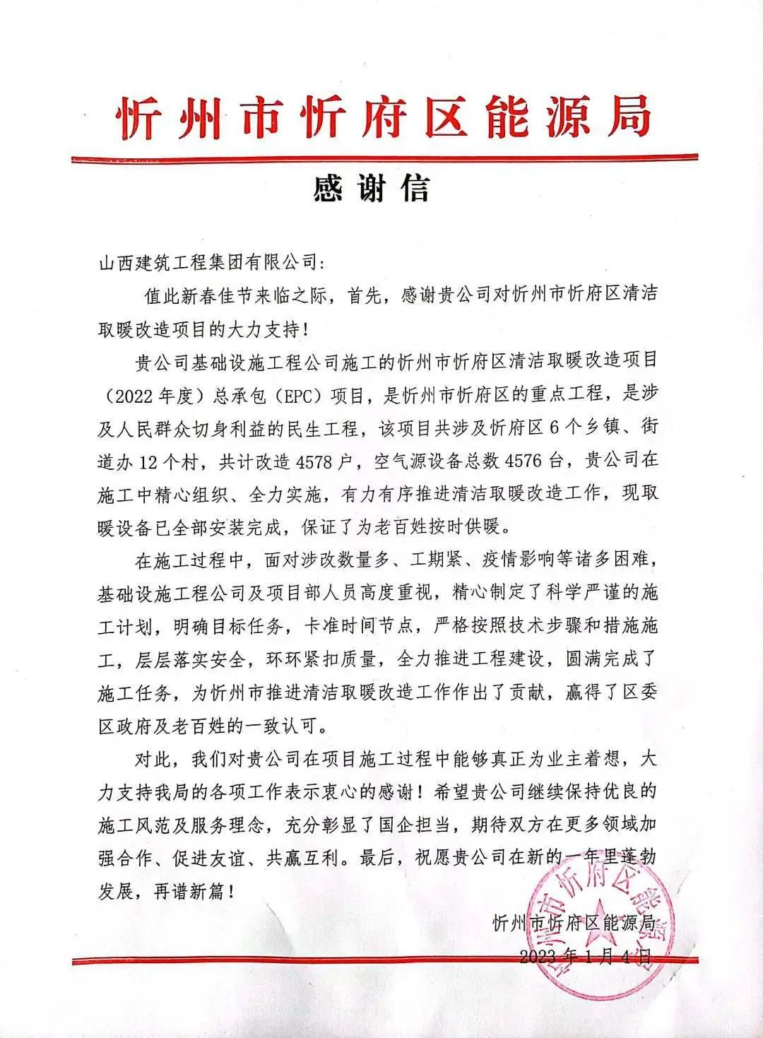 山西建投建工集團(tuán)忻府區(qū)清潔取暖改造項(xiàng)目(2022年度)總承包(EPC)項(xiàng)目收到業(yè)主感謝信