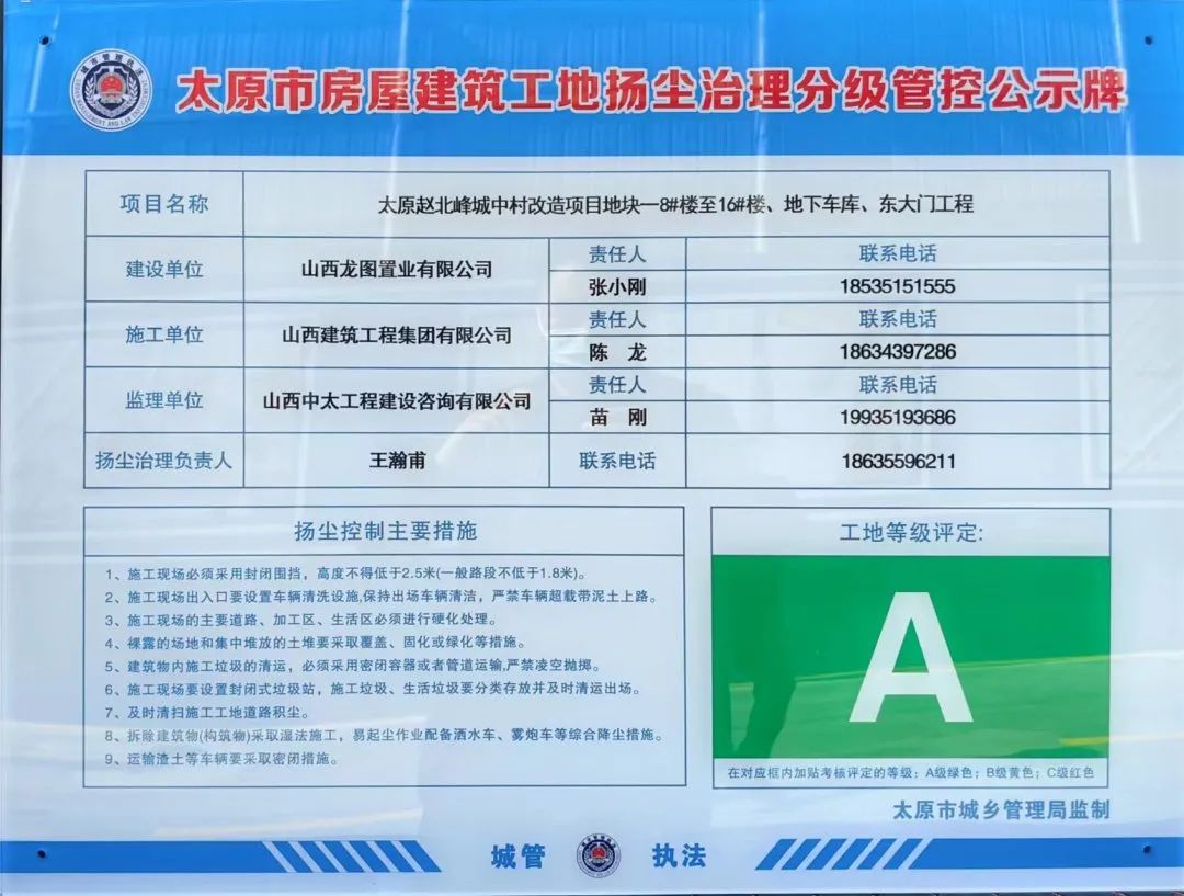 太原市城鄉(xiāng)管理綜合行政執(zhí)法隊作為改善省城空氣環(huán)境質(zhì)量、提升房屋建筑工程揚(yáng)塵治理污染防治水平的實施單位,對太原市所有房建項目進(jìn)行了揚(yáng)塵管控等級評定和差異化管控。趙北峰城中村改造工程地塊一項目作為受檢工地,順利通過“六個百分百”執(zhí)行情況、揚(yáng)塵在線監(jiān)控落實情況、“三項費(fèi)用”(安全文明施工費(fèi)、臨時設(shè)施費(fèi)、環(huán)境保護(hù)費(fèi))落實情況等9項考評檢查,成為五個“綠色施工A級工地”授牌單位之一。