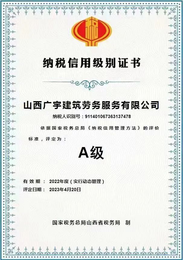 近日,國家稅務(wù)總局山西省稅務(wù)局公布了2022年度納稅信用A級納稅人名單,廣宇建筑勞務(wù)公司再次榮獲“納稅信用級別A級”證書。這是該公司連續(xù)三年被評為“納稅信用級別A級”企業(yè)。