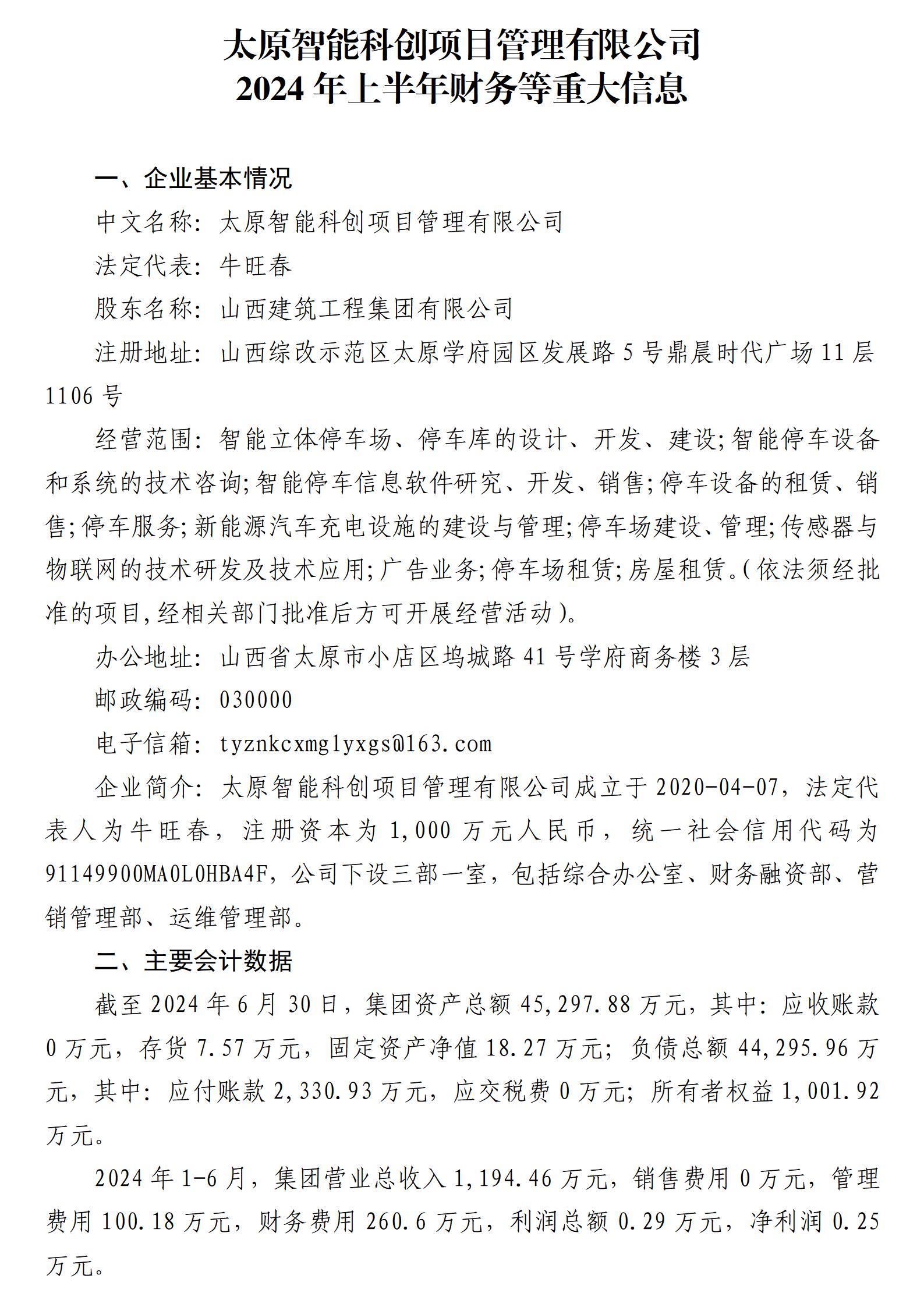 太原智能科創(chuàng)項目管理有限公司2024年上半年財務(wù)等重大信息