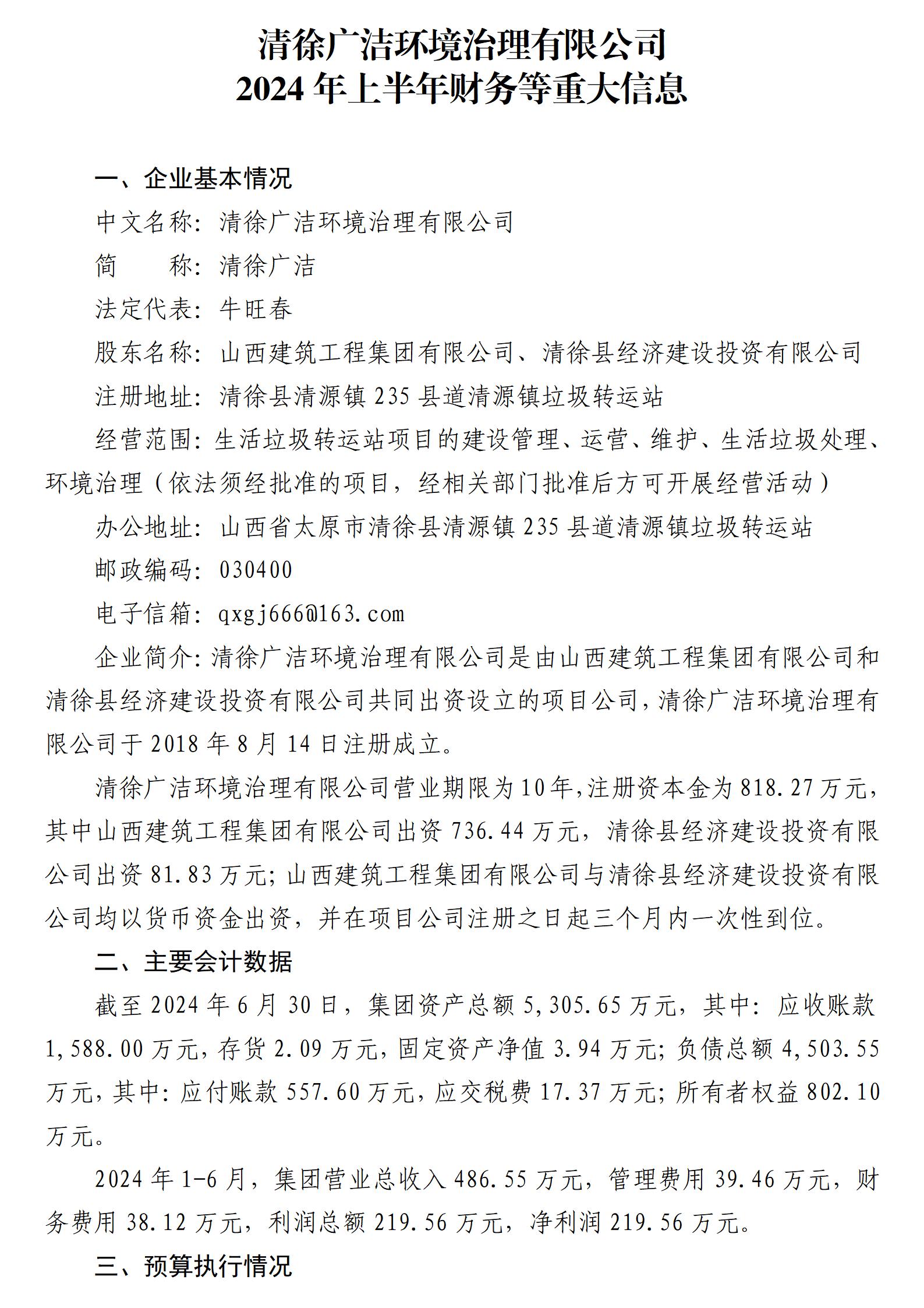 清徐廣潔環(huán)境治理有限公司2024年上半年財務(wù)等重大信息