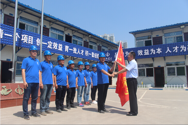 隨后,項目部舉行授旗儀式,向英華為項目部授“工人先鋒號”旗,在建工藍的映襯下,紅色的“工人先鋒號”旗格外醒目,授旗儀式簡短而隆重。授旗儀式上,向英華將“工人先鋒號”旗交到項目經理李高鵬手中。隨后,他在講話中要求項目部不斷增強使命意識,認真履行職責,深入開展形式多樣的項目建設勞動競賽,重安全、保質量、抓進度,確保按時保質完成施工任務,團結帶領廣大職工為推動項目創(chuàng)魯班獎作出更大的貢獻。