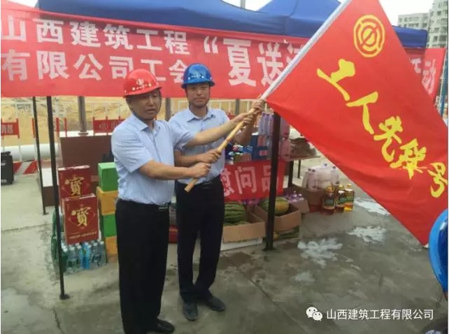 慰問中,向主席將購買的毛巾、沐浴露、西瓜、綠豆、冰紅茶、豬肉等慰問品一一發(fā)送給項(xiàng)目管理人員、班組及作業(yè)人員,并授予項(xiàng)目“工人先鋒號(hào)”旗。