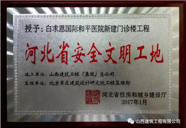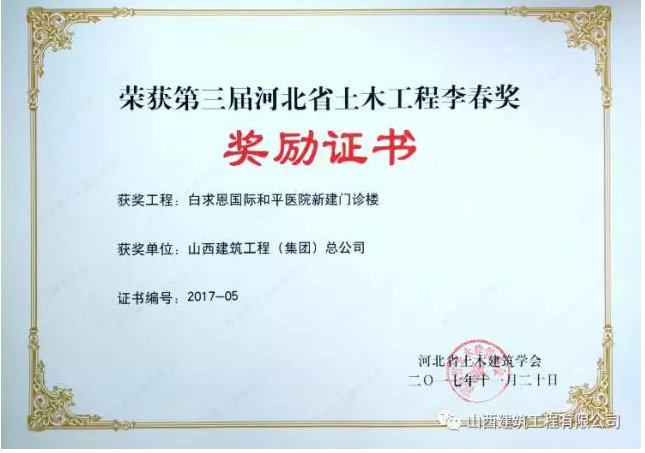 - 近日,由華北分部承建的白求恩國際和平醫(yī)院新建門診樓工程喜獲第三屆河北省土木工程李春獎。該工程是今年獲得此項榮譽的五個項目之一,也是唯一一個由省外施工單位承建的獲獎項目。