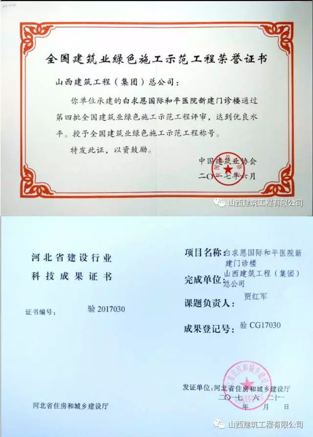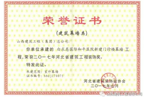 2017年,該項目在品牌創(chuàng)建上還獲得多項大獎。先后獲得“河北省安全文明工地”、“河北省新技術(shù)應(yīng)用示范工程”、“第四批全國建筑業(yè)綠色施工示范工程”、“河北省建筑工程裝飾獎”;通過驗收并公示的獎項有“石家莊市興石杯(市優(yōu))”和“河北省建設(shè)工程安濟杯獎(河北省優(yōu)質(zhì)工程)”;已申報待驗收的獎項還有“山西省汾水杯獎(山西省優(yōu)質(zhì)工程最高獎)”、“山西省‘太行杯’土木建筑工程大獎”。
